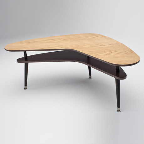 Стол Бумеранг выполнен в классическом модернистском стиле 50-х г.г., который с легкостью сочетает в себе функциональность и эстетику. Двухьярусный столик выкрашеный в кофейный цвет, верхняя столешница покрыта дубовым лакированным шпоном; опирается на три «летящие» ножки. Инструкция по сборке прилагается.
