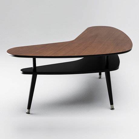 Стол Бумеранг выполнен в классическом модернистском стиле 50-х г.г., который с легкостью сочетает в себе функциональность и эстетику. Верх столешницы покрыт мореным дубовым шпоном; нижняя часть столешницы покрашена в темно-коричневый цвет; 2-я столешница полностью покрашена в темно-коричневый цвет. Опирается на три «летящие» ножки. Инструкция по сборке прилагается.