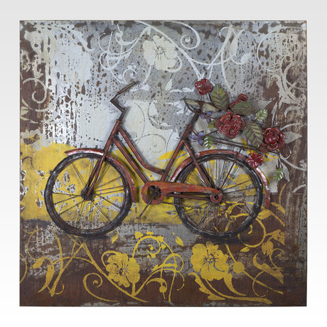 Картина «Велосипед» создана в нестандартной манере, широко выходящей за рамки привычных представлений. Смешение стилей, фон с винтажными узорами, и применение разноразмерных железных элементов внесут в интерьер новизну и романтику первых свиданий.