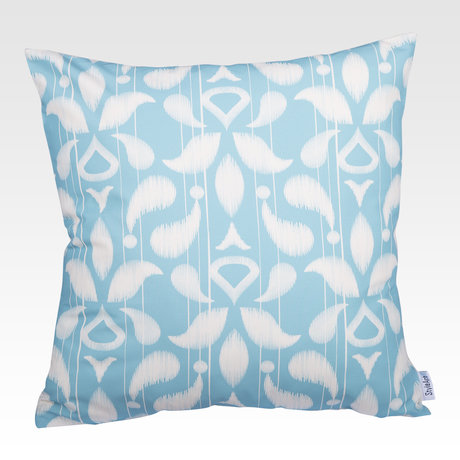 Подушка с белым орнаментом на нежно-голубом фоне. Материал наволочки - экологически чистое и устойчивое к многократным стиркам микроволокно. Узор аксессуара особенно уместен в таких стилях интерьера, как прованс, винтаж и кантри.