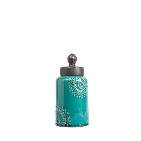 Декоративная банка Menhindi Piccolo – это изысканная емкость, выполненная в модном стиле «прованс»: изготовлена из грубой керамики, по всей поверхности имеет искусственные потертости, неброский аквамариновый цвет и незамысловатая лепка в виде цветов на боках аксессуара. В такой банке вы сможете хранить сыпучие продукты питания или просто нужные безделушки.