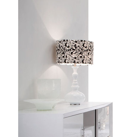 Настольная лампа на фигурной ножке, покрытой белым блестящим лаком. Абажур сделан из текстиля на пластиковой основе. Предназначена для 1 лампочки накаливания Е27 60 Ватт или 1 энергосберегающей лампочки Е27 12 Ватт.
