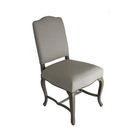 Стул выполнен из массива дерева, обит льняной тканью серовато-бежевого цвета.