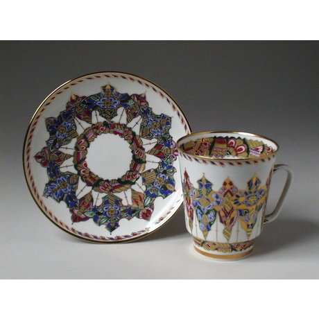 Чайная пара в этническом стиле, привнесет в дом непередаваемую атмосферу таинственного Востока. Сама идея арабески — изысканно-утонченного орнамента — созвучна представлениям исламских богословов о "вечно продолжающейся ткани Вселенной". Орнамент из причудливых геометрических форм выполнен как на внешней, так и на внутренней стороне чашки и украшает блюдце.