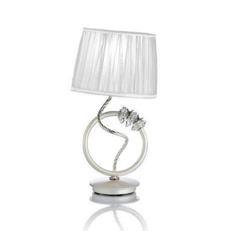 Настольная лампа серии OMBRELLO отличается оригинальным дизайном: металлическое основание с покрытием "белый перламутр" и витое хромированное крепление под абажуром из органзы белого цвета. Такое сочетание разного покрытия металла создает яркое ощущение современного стиля. Световой элемент один. Бра декорировано розетками из прозрачного хрусталя Swarovski.