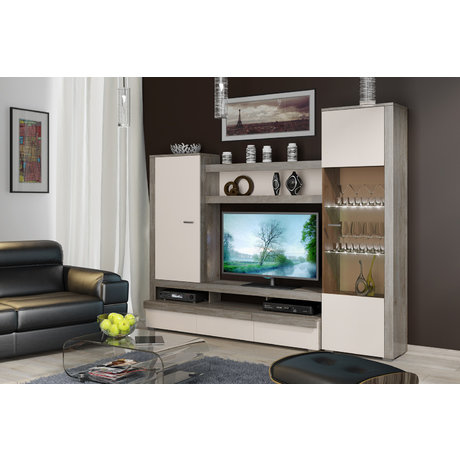 Гарнитур "Эйва" - стильное оформление вашей гостиной. Сочетание светлых лицевых панелей и боковин цвета дуба верцаска делает гарнитур подходящим для интерьеров любого стиля.
