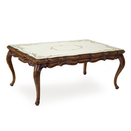 Столик опирается на изящные ножки кабриоли. В отделке используется искусная тонкая резьба ручной работы. Столешница изготовлена из зеркала в художественной технике эгломизе с ручной росписью.