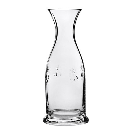 Графин вытянутой формы с узким горлышком, расширяющимся к верху изделия. Лаконичная обтекаемая форма из прозрачного стекла выглядит свежо и ненавязчиво. Украшением служат изображения насекомых.