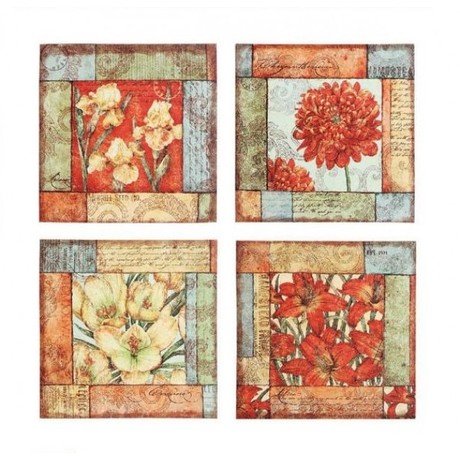 Квадратная тканевая картина привлекает колоритом цветочных мотивов. Броские теплые оттенки и винтажные элементы в изображении расставят акценты в интерьере.
