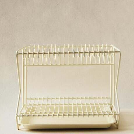 Сушилка для посуды с металлической конструкцией и белым поддоном.