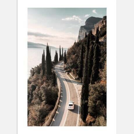 Мирная фотография с прекрасным видом на озеро Гарда в Италии. Автомобиль едет по извилистой дороге, окруженной озером и красивой зеленью. Теплые цвета солнца в сочетании с голубым небом создают красивое цветовое сочетание. Мы любим природные принты, которые делают наш дом более живым и гармоничным. Плакат By Lago di Garda имеет встроенную белую окантовку, элегантно обрамляющую мотив.