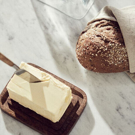 Масленка с деревянной подставкой из манго и прозрачной стеклянной крышкой с ручкой. Размеры подставки: длина 15 см, ширина 11 см, высота 1,5 см; крышка: длина 13,4 см, ширина 9,4 см, общая высота около 10 см.