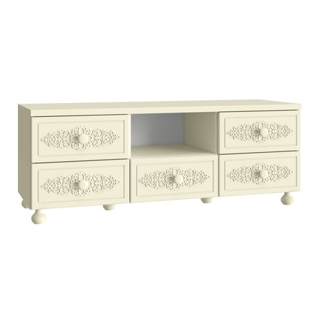 Тумба под ТВ Ассоль АС-56 оснащена пятью выдвижными ящиками и нишей для различной аппаратуры. Такую модель можно использовать как тумбу под телевизор, так и просто как тумбу для различных вещей. Мебель изготовлена из качественной ламинированной ДСП 16 мм. В оформлении фасадов МДФ применяется уникальная технология нанесения объемного узора 3D. Высота опоры 65 мм. Фурнитура: телескопические направляющие полного выдвижения без доводчиков, ручки пластик, опоры деревянные.