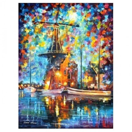 Буйство цвета и оригинальная техника сделали незабываемыми картины Леонида Афремова. Методика рисования, которую Афремов оттачивал и совершенствовал не одно десятилетие, основана на использовании ножа вместо кисти. Палитрой также является сам нож, которым художники пользуются для удаления краски с холста. Результатом такого оригинального подхода является уникальный художественный стиль, который невозможно спутать ни с одним другим. Работы Леонида Афремова заполнены южным солнцем и яркими цветами, живопись его позитивна и радостна. И сам художник является оптимистом, что и отражено в его творчестве. Его картины делают зрителей светлее и позитивнее. А изображённая на картине мельница заключает в себе символику ветра и воздуха, олицетворяет сбор урожая и плодородие. Такая картина, раскрашенная Вашими руками, будет способствовать изобилию в доме.