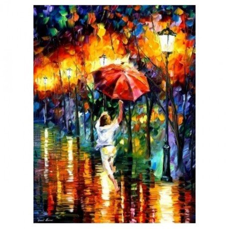 Парадокс состоит в том, что, в то время как люди обычно говорят, что им не нравится дождь, они имеют тенденцию считать дождливую погоду очень таинственной и романтичной. К счастью, есть художники, которые решают эту проблему. Работы Леонида Афремова часто посвящаются дождю. Ему удаётся поймать моменты мечтательности, которые вдохновлены, например, неизвестной женщиной, которая идет перед Вами под дождём босиком, как будто она была принцессой этого дождливого королевства. Кто она в действительности? Куда она идет? Возможно, это даже не имеет значения, но в течение одного прекрасного момента она заставляет Вас забыть обо всем остальном в этом мире. Если Вы ищете произведение искусства, которое станет самой замечательной частью Вашего интерьера - Вы нашли его. Прекрасная игра света и тени, яркие цвета, которые создают оптимистическое настроение - такая красочная и восхитительная картина не останется незамеченной.