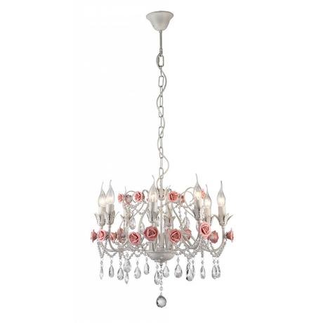 Назначение светильника: для гостиной, Стиль светильника: флористика, Тип: подвесная, Материал светильника: металл, Диаметр: 590 мм, Высота: 340 мм, Количество ламп: 8 шт., Тип лампы: накаливания, Мощность: 320 Вт, Патрон: Е14, Цвет арматуры: белый/розовый