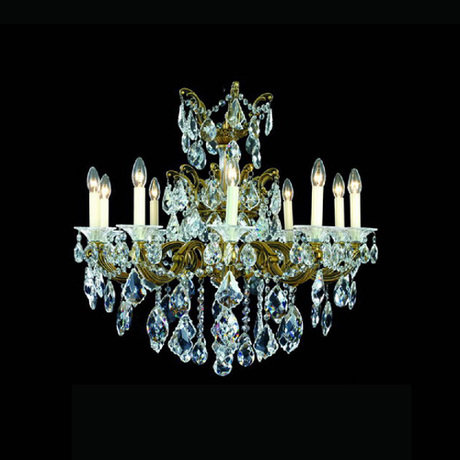 Люстра с арматурой цвета античной меди. Украшена прозрачными хрустальными подвесками. Дизайн ламп выполнен в виде свечей в подсвечниках. Люстра может стать изысканным украшением интерьера гостиной или столовой.