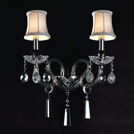 Бра 2-х рожковое из коллекции Bellona с хромированной арматурой черного цвета и прозрачными хрустальными подвесками. Светлые текстильные абажуры приглушают свет ламп, что привносит в интерьер гостиных или парадных холлов роскошь и романтику. Количество лампочек: 2;