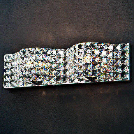 Настенный светильник ONDA выполнен в виде волнообразной пластины из соединенных между собой стеклянных кристаллов оригинальной огранки. Основа светильника металлическая хромированная. Световой поток рассеянный, нежный. Данная модель создаст комфортную и уютную атмосферу в помещении.