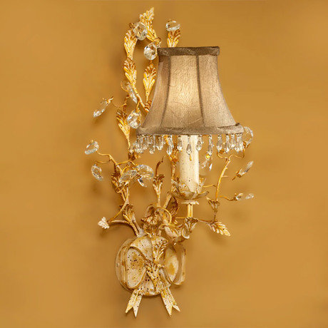 Настенный светильник серии VERDI выполнен во флорентийском стиле. Плафон бежевого цвета с подвесками из граненого стекла наполовину прикрывает световой элемент в виде свечи. Основание светильника металлическое с покрытием позолоченная слоновая кость . Бра украшено декоративными элементами в виде стеблей и листьев. Элементы дополнены подвесками из граненого стекла.