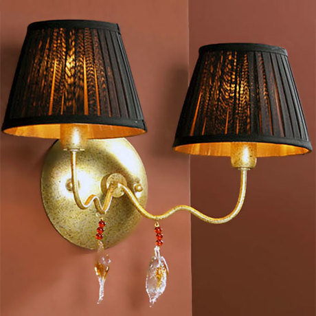 Настенный светильник CORAL выполнен из металла с покрытием "золото с чёрными крапинками". Оснащен двумя световыми элементами под плиссированными абажурами черного цвета. Внутренняя поверхность абажуров золотистая. Бра декорировано подвесками-листьями из прозрачно-янтарного стекла и красными стеклянными бусинами.
