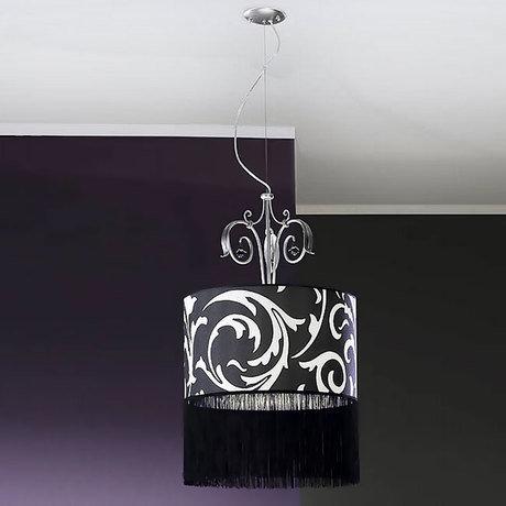 Подвесной светильник LA DIVINA с абажуром черного цвета с белыми узорами. Дополнительно абажур декорирован черной бахромой. Абажур бумажный с пластиковой подложкой. Арматура светильника из металла с серебряным покрытием.