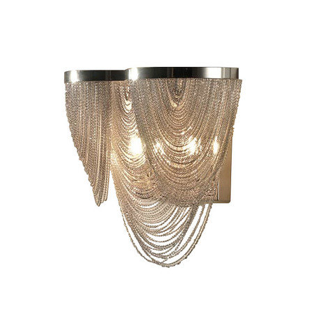 Настенный светильник MINERVA выполнен полностью из никелированного металла. Светильник украшен тонкими декоративными металлическими цепями (нитями) в виде каскадов.