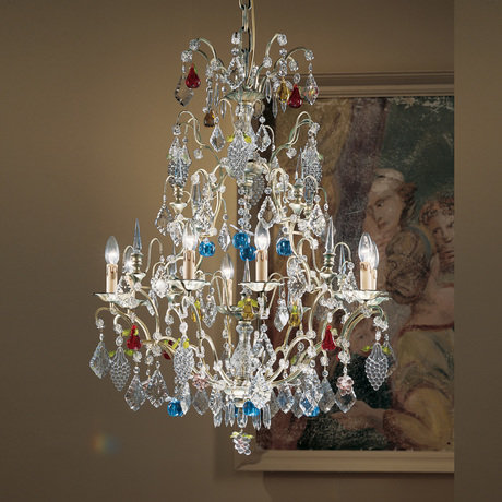 Люстра 8-ми рожковая из коллекции OLD STYLE на арматуре из металла, покрытого золотом с зеленой патиной. Декор: прозрачные фрукты и разноцветные подвески с кулонами из хрусталя. Высота светильника регулируется за счет звеньев цепи.