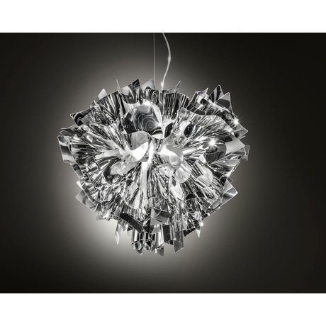Подвесной светильник VELI с оригинальным дизайном. Плафон серебряного цвета выполнен из необычного материала под названием STEELFLEX. Это материал, получаемый в процессе металлизации поликарбоната. В результате этого процесса появляется инновационный материал с абсолютно отражающей зеркальной поверхностью. При этом материалы сохраняют гибкость – важнейшее качество всех листовых материалов, используемых SLAMP. Высота светильника регулируется до 140 см. Дизайн: Adriano Rachele.