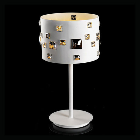 Настольная лампа из коллекции Gemma с металлическим плафоном белого цвета. Украшена прозрачным и темным хрусталем.