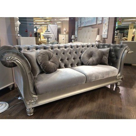 Мы предлагаем шикарный трехместный диван, который отлично впишется в элитный классический интерьер. Для создания этого мебельного шедевра производители использовали материалы высокого качества. Удобно выгнутая спинка дивана оформлена декоративной стежкой - капитоне. Отделка сусальное серебро silver leaf, ткань серебристо-серый велюр, пуговицы в ткани.