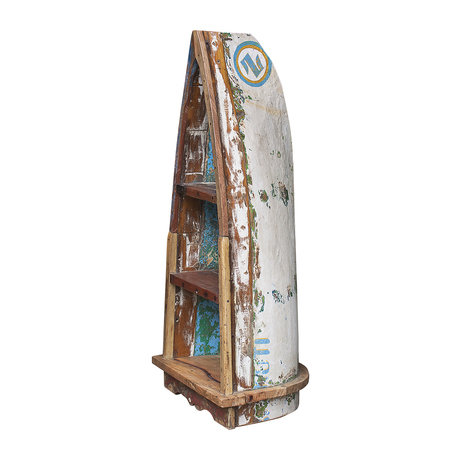 Напольный стеллаж, выполненный из старой рыбацкой лодки бочковидной формы с сохранением оригинальной многослойной окраски.