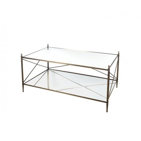 Изысканный и элегантный журнальный стол с металлическим каркасом и прямоугольной стеклянной столешницей гармонично впишется в интерьер любой комнаты в стиле арт-деко. Расположенная под столешницей и полностью повторяющая ее форму полка делает данный предмет мебели более удобным и функциональным.