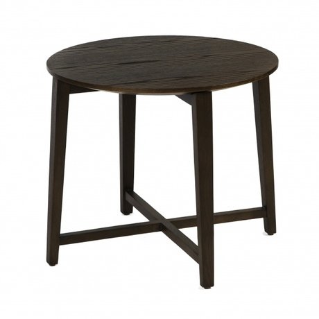 Журнальный стол с круглой столешницей, выполненный из натурального дерева и покрытый коричневым лаком, станет удачным дополнением современного интерьера, служа подставкой для рамок с фотографиями, цветов или элементов декора и различных мелочей.