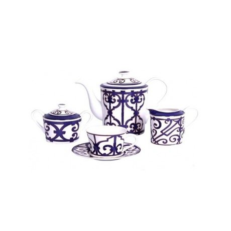 Вдохновленный модными творениями дома Hermes чайный сервиз, изготовленный из тончайшего английского фарфора и декорированный оригинальным ярким орнаментом фиолетового цвета, украсит семейное чаепитие или торжество. Сервиз рассчитан на 4 персон и состоит из 11 предметов: чайник, 4 чайных пары (чашка и блюдце), молочник и сахарница.
