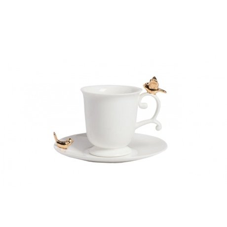 Элегантная чайная пара из грубой керамики в элегантном белом цвете, украшенная объемными фигурками птиц с золотым напылением, что вносит в простой дизайн оригинальность и выразительность. В пару входят чашка и блюдце. Дополнительным украшением чашки является плавно изогнутая ручка замысловатой формы.