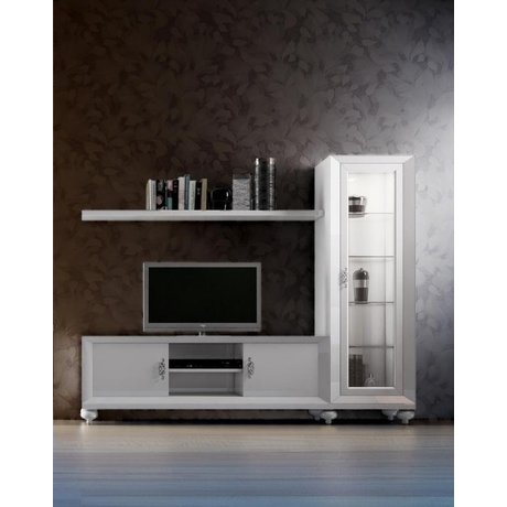 Модульная стенка выполнена в стиле Ар деко. Отделка белый блестящий лак. В композицию входит: ТВ тумба, витрина, база с ножками. По желанию клиента можно менять местами витрину и ТВ тумбу при сборке. Полка в цену композиции не входит.