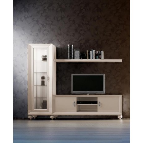 Модульная стенка выполнена в стиле Ар деко. Отделка бежевый блестящий лак. В композицию входит: ТВ тумба, витрина, база с ножками. По желанию клиента можно менять местами витрину и ТВ тумбу при сборке. Полка в цену композиции не входит.