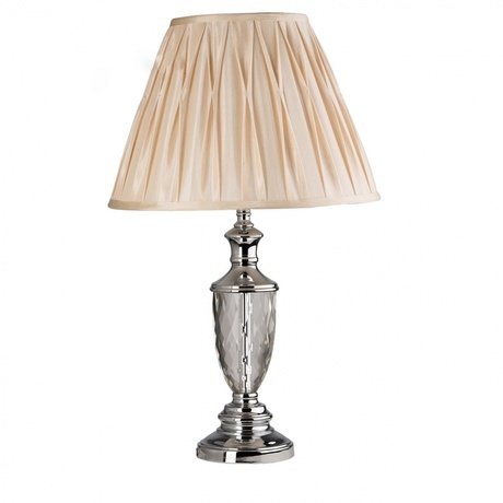 Лампа настольная с бежевым абажуромТатьяна НинуаЛампа выгладит очень нежно. Прозрачная стеклянная ножка под хрусталь на основании из металла. Сколы, царапины отсутствуют. Светло бежевый абажур. Цвет соответствует фото.